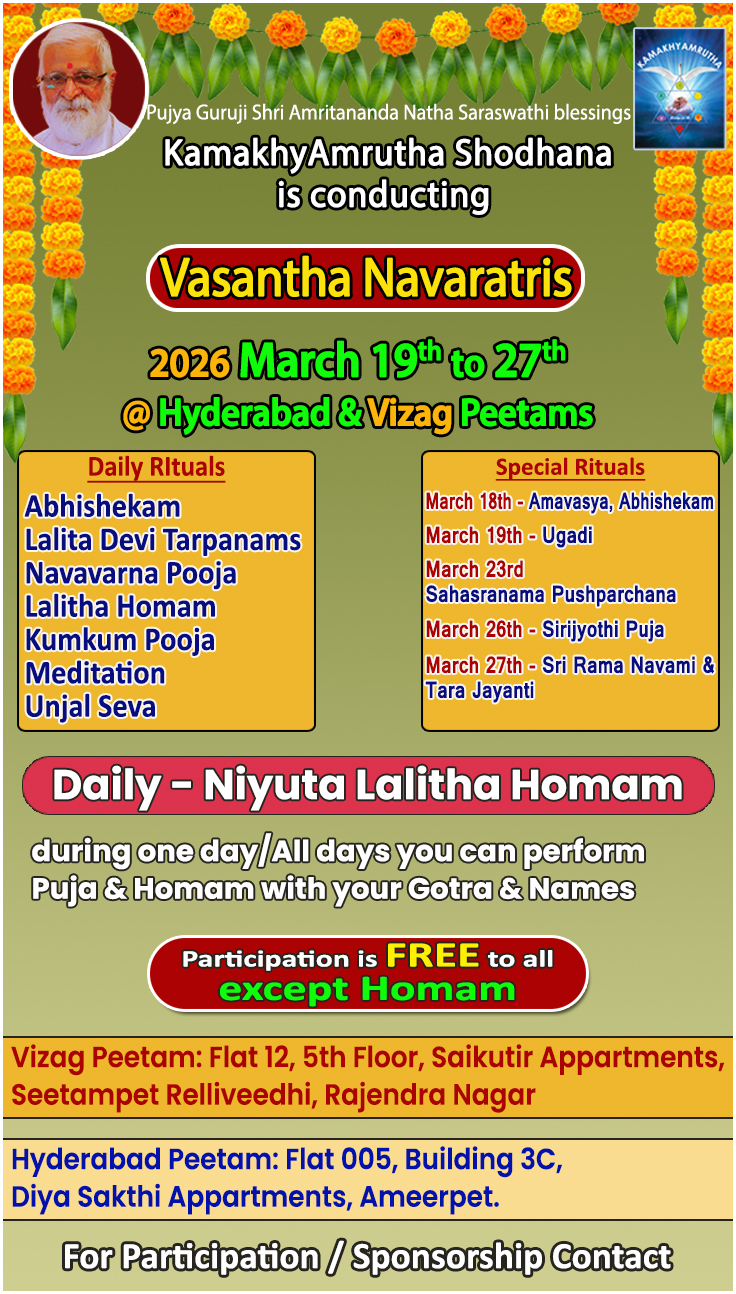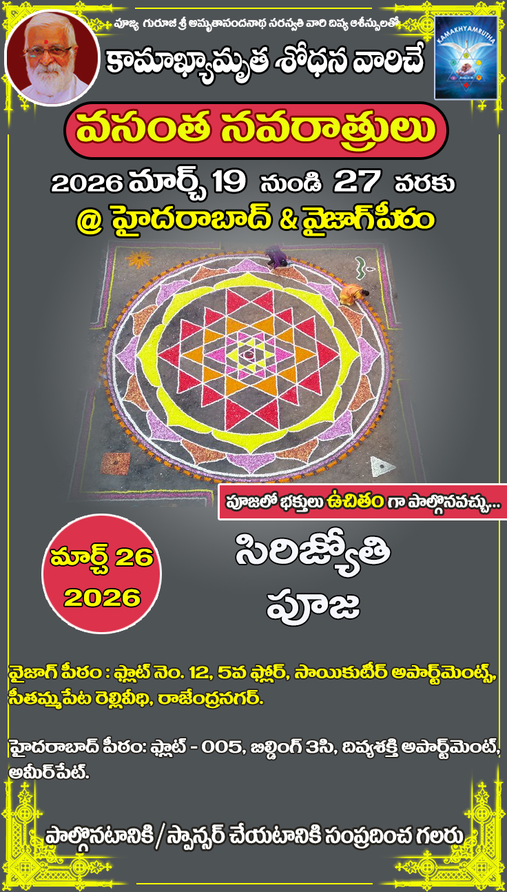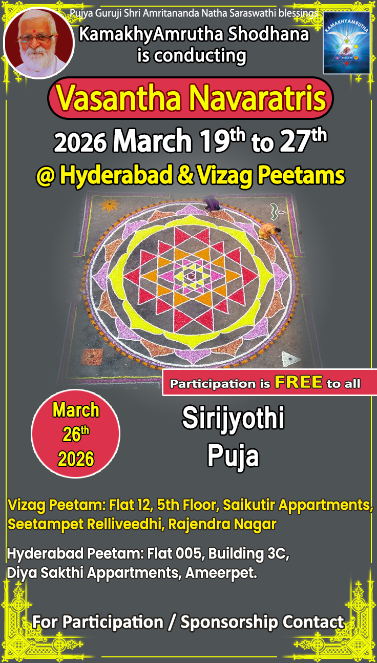 One can avail Online and Offline classes based on their availability and need. The main aim is to follow and spread Guruji’s (Shri AmritanandaNatha ) Teachings .Srividya connects this body with Divine mother, the basic theme is expansion of Consciousness. The Greatness of Srividya is to connect Science with Spirituality .The purpose of Srividya is Self realization(Transformation). Join the classes , Learn Srividya and Learn to Enjoy the Life.