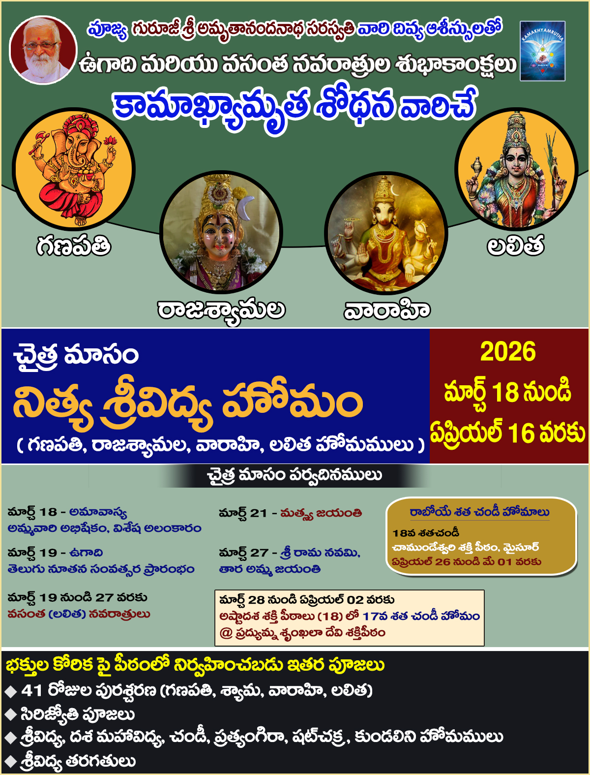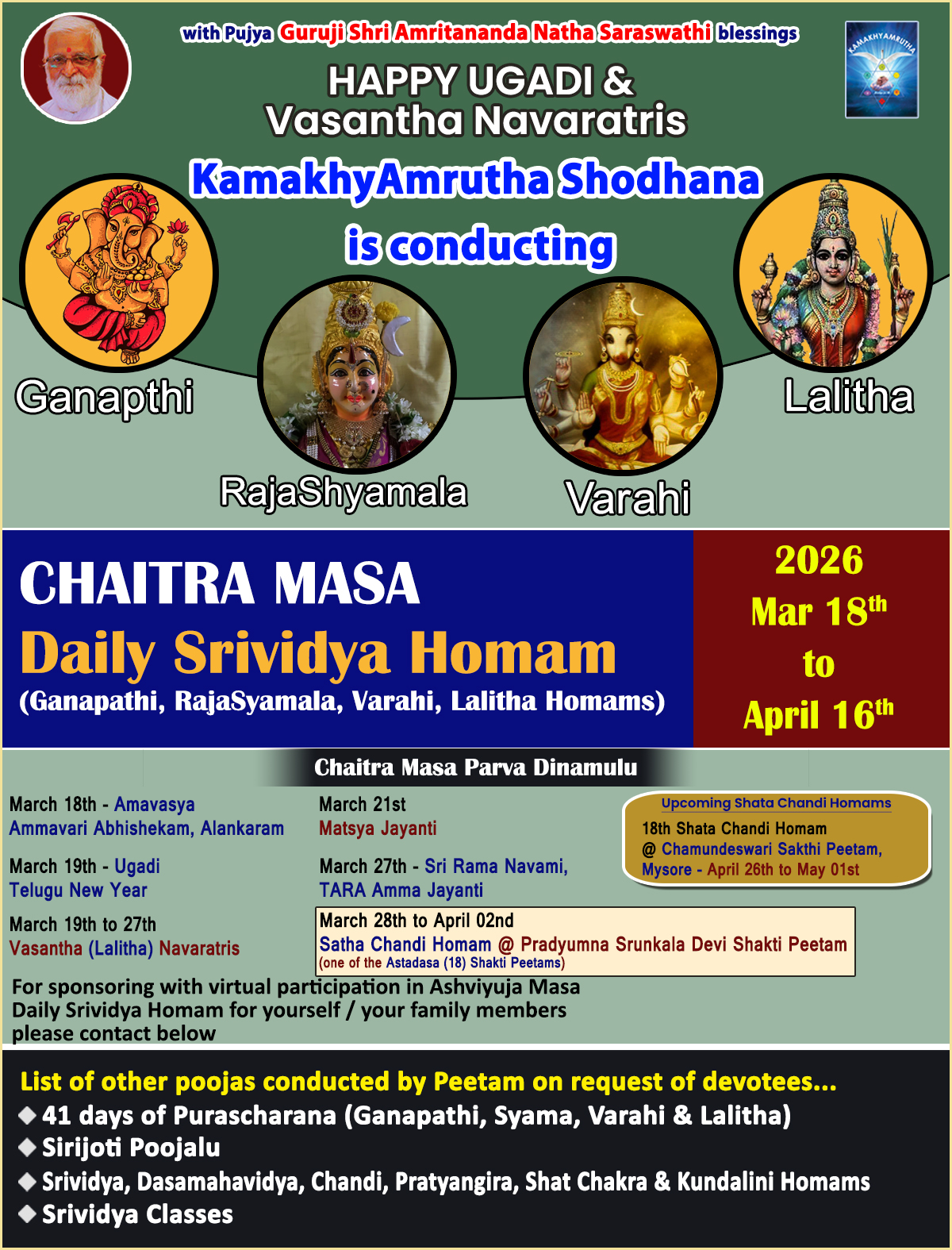 People say that learning and Practising srividya is a fortune VenuShyama Amma is conducting Teaching Sessions including Shri Ganapathi Workshop, Shri Raja Shyamala, Shri Varahi and , Shri Lalitha also. Empowering rituals Like Kalavahana and Meditation .