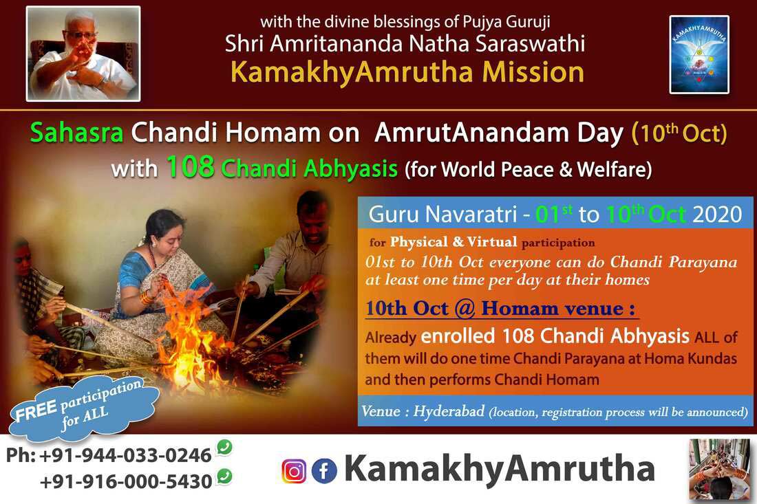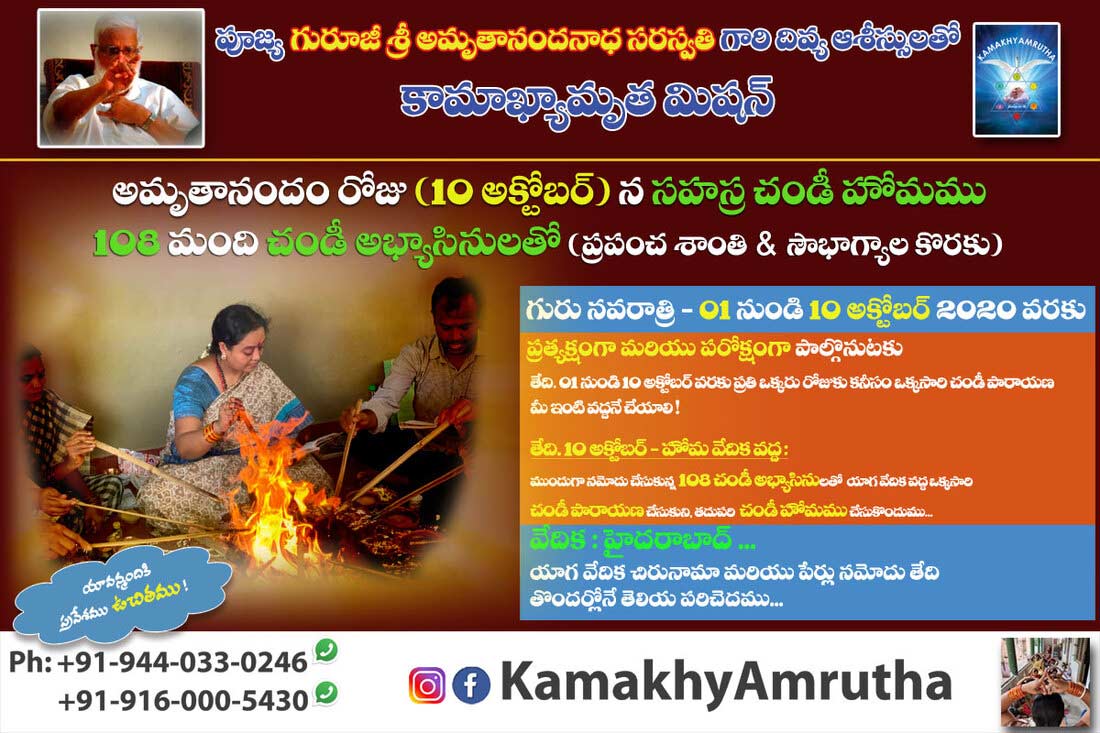10th Oct, Guruji merged into Mother Goddess. KamakhyAmrutha observes this day as AmrutAnandam Day.